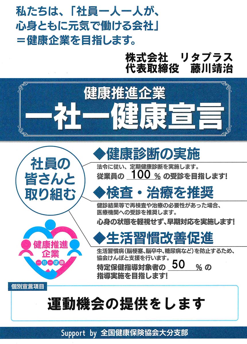従業員の健康を会社の財産ととらえ、従業員の健康づくりに積極的に取り組みます。